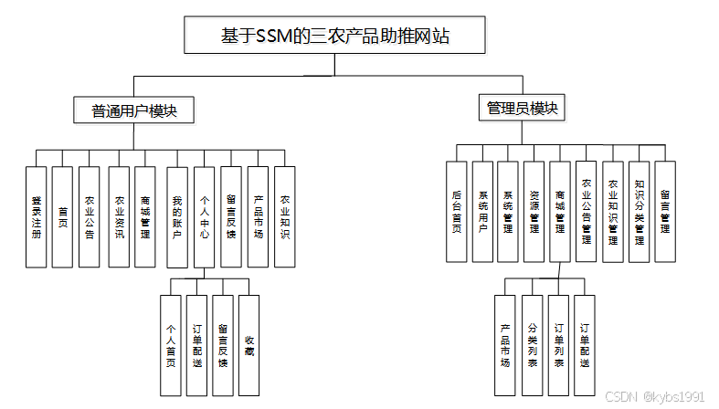 在上一章节中主要对网站的功能性需求和非功能性需求进行分析,并且根据需求分析了本网站中的用例。那么接下来就要开始对本网站的架构、主要功能和数据库开始进行设计。基于SSM的三农产品助推网站根据前面章节的需求分析得出,其总体设计模块图如图3-2所示。