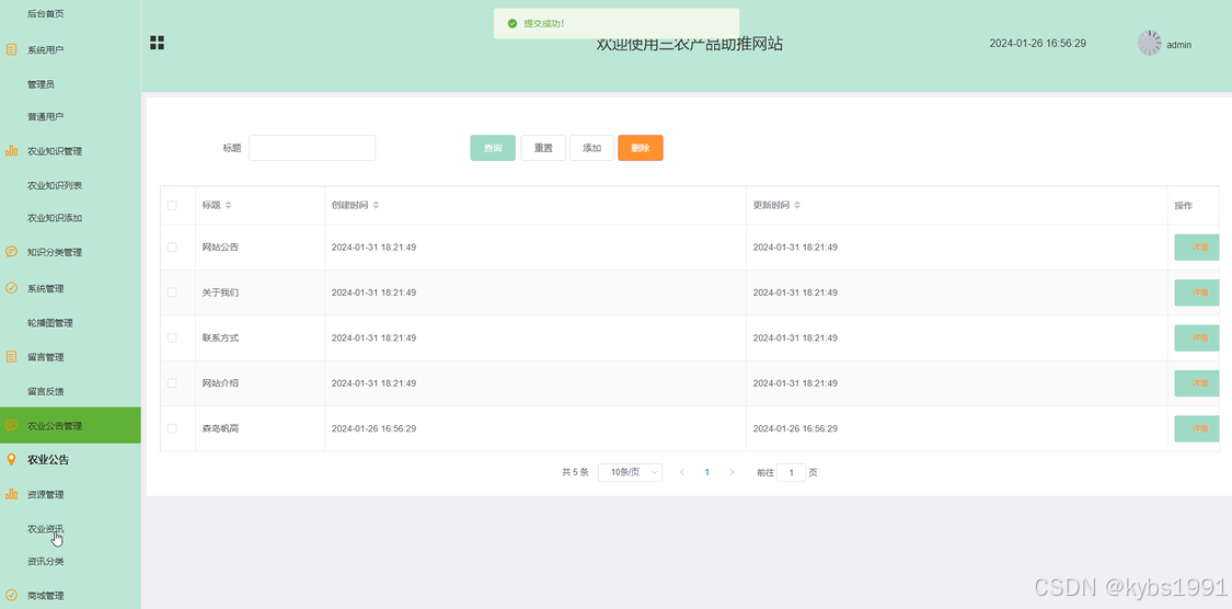 管理员点击“农业公告管理”菜单,管理员可以查看和管理网站上的所有农业公告信息,包括添加、修改或删除农业公告等操作,界面如下图所示。