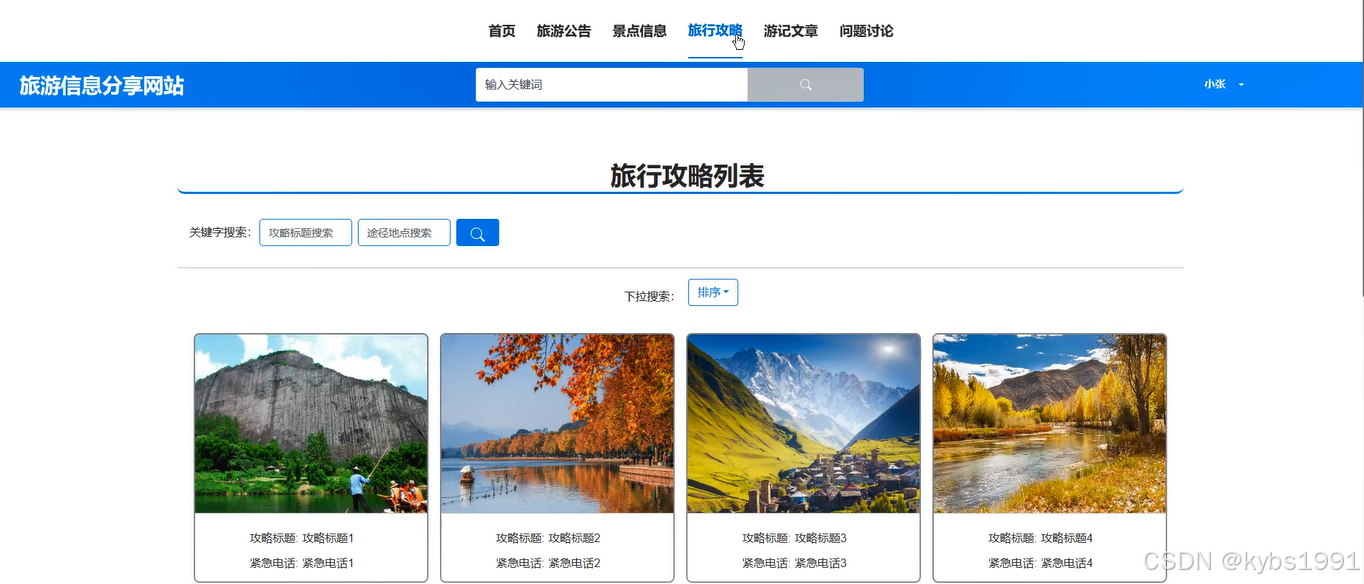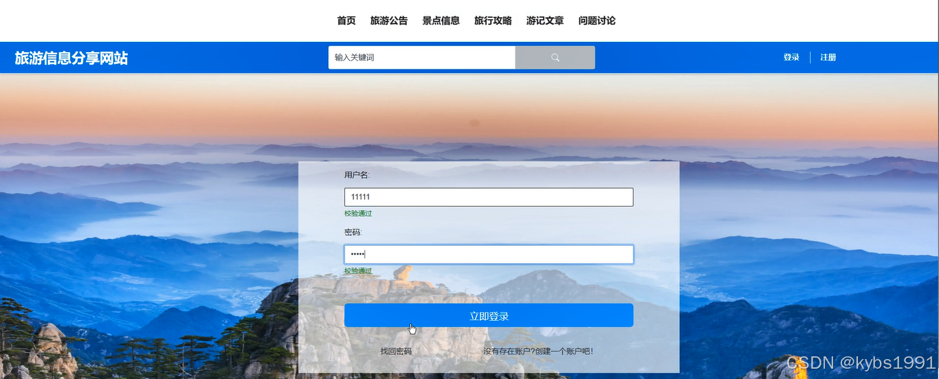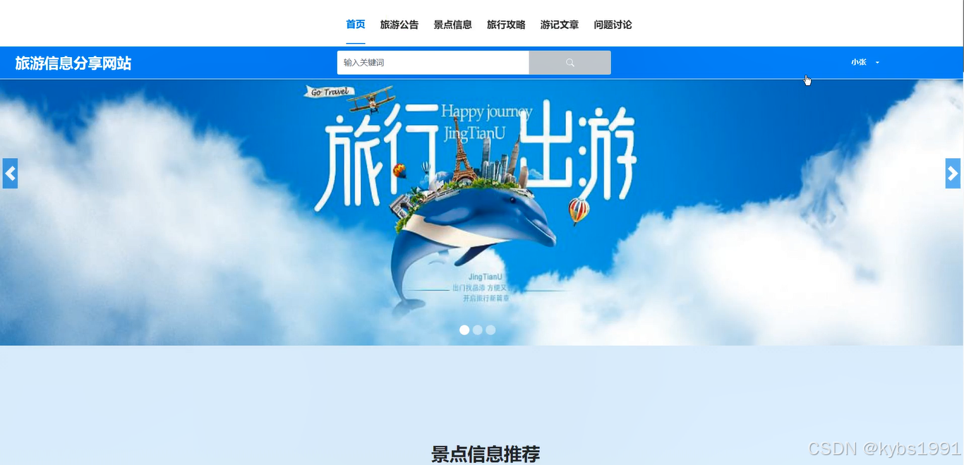 (2)首页:当进入旅游信息分享网站的时候,系统以上中下的布局进行展示,首先映入眼帘的是系统的导航栏,下面是网站公告、景点信息推荐等咨讯。