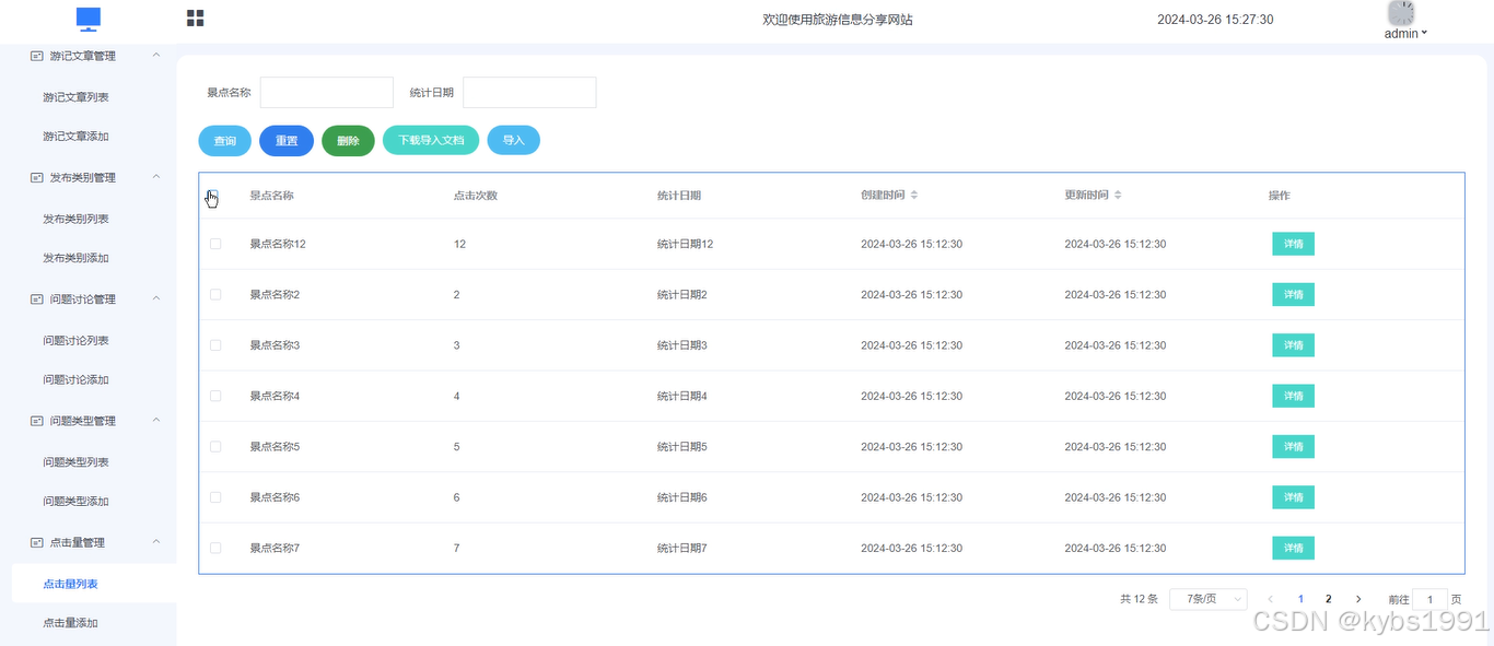 (10)点击量管理:管理员点击可查看点击量列表,可对点击量进行删除,同时可点击“导入”按钮进行导入新的点击量数据。