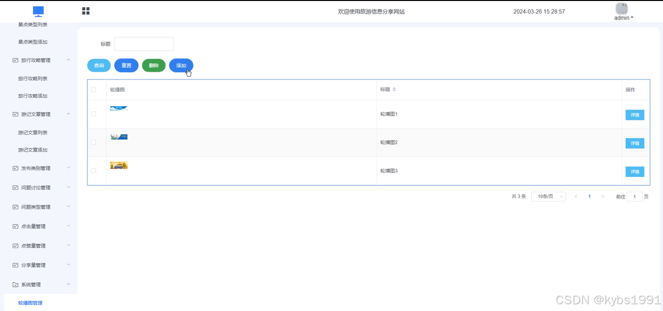 (13)系统管理:管理员点击可查看轮播图,如需添加新的轮播图,点击右侧“添加”按钮,上传图片,输入标题,点击“确认”按钮进行添加;同时可对轮播图进行增删改查。