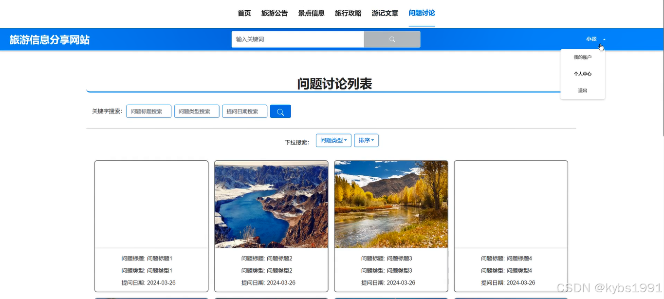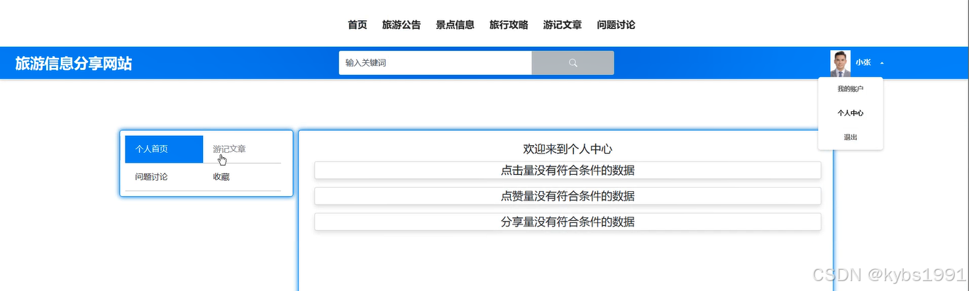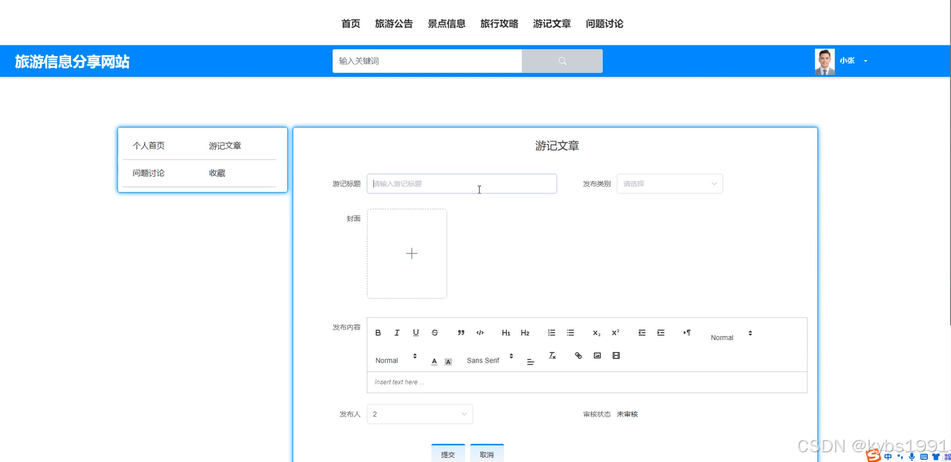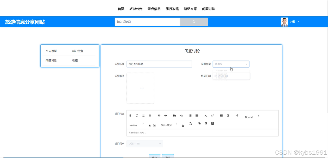 (8)个人中心:用户点击头像可查看“个人中心”,包括个人首页、游记文章、问题讨论和收藏。点击“游记文章”“添加”,输入游记标题,选择发布类别,上传封面,输入发布内容,选择发布人,点击“提交”按钮进行添加。点击“问题讨论”“添加”,输入问题标题,选择问题类型,上传问题截图,选择提问如期,输入提问内容和选择提问用户,点击“提交”按钮进行添加。