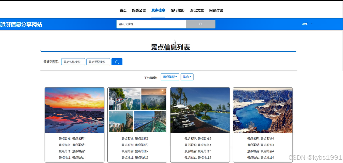 (4)景点信息:用户点击可通过搜索景点名称和景点类型进行查看讲点信息列表;同时可对景点信息进行点赞、收藏和评论。