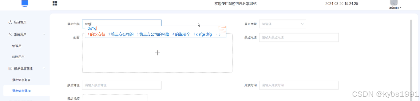 (3)景点信息管理:管理员点击可查看景点信息列表和景点信息添加;点击“景点信息添加”,输入景点名称,选择景点类型,上传封面,输入景点电话、景点地址和开放时间,上传景点视频和景点介绍,点击“提交”按钮进行添加。