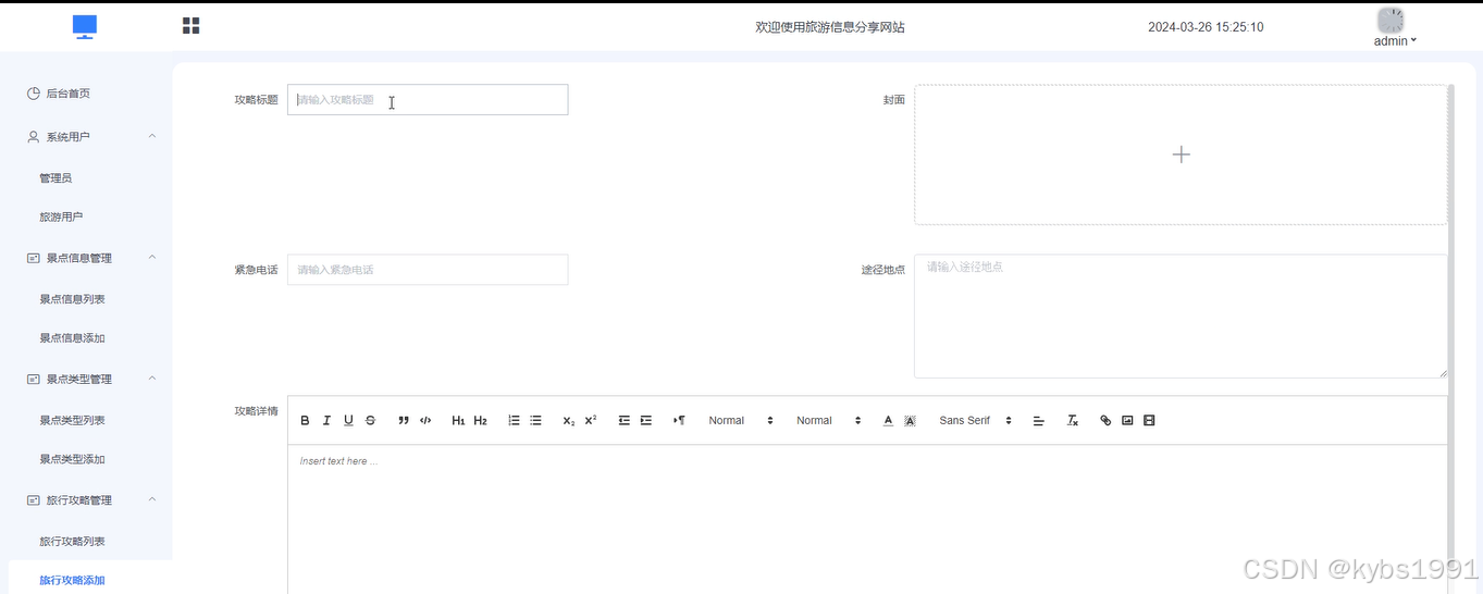 (5)旅行攻略管理:管理员点击可查看旅行攻略列表和旅行攻略添加;点击“旅行攻略添加”,输入攻略标题,上传封面,输入紧急电话、途径地点和攻略详情,点击“提交”按钮进行添加。