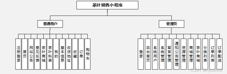 (3)在茶叶销售小程序中,首先要确定系统的技术,然后进行在线确认,以确定系统的用户角色,并根据这些角色划分出相应的功能模块。系统的设计主要将用户分为管理员、员工和用户角色,每个角色都有其独特的特点,而且每个功能模块都有其特定的功能,但是系统的数据库都是交互式的,用户可以随时根据自身的需求查看购物信息,而系统的工作人员则可以根据自身的职责,处理和操作在线信息。管理员可以快速收集用户的详细信息,并能够在第一时间响应用户的需求。