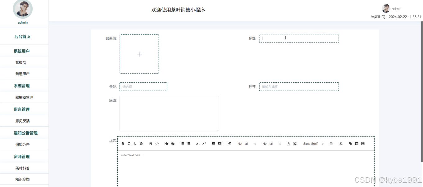 资源管理:当管理员点击“资源管理”时,可查看茶叶科普咨讯和知识分类。如需添加新的茶叶科普,点击“添加”按钮,上传封面图,输入标题,选择分类,输入标签、描述和正文,点击“提交”按钮进行添加。同时可对咨讯进行增删改查。界面如下图所示。