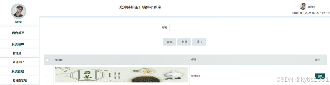 (4)系统管理:当管理员点击“系统管理”时,可查看轮播图; 如需添加新的轮播图,点击右侧“添加”按钮,上传图片,输入标题,点击“确认”按钮进行添加;同时可对轮播图进行增删改查。