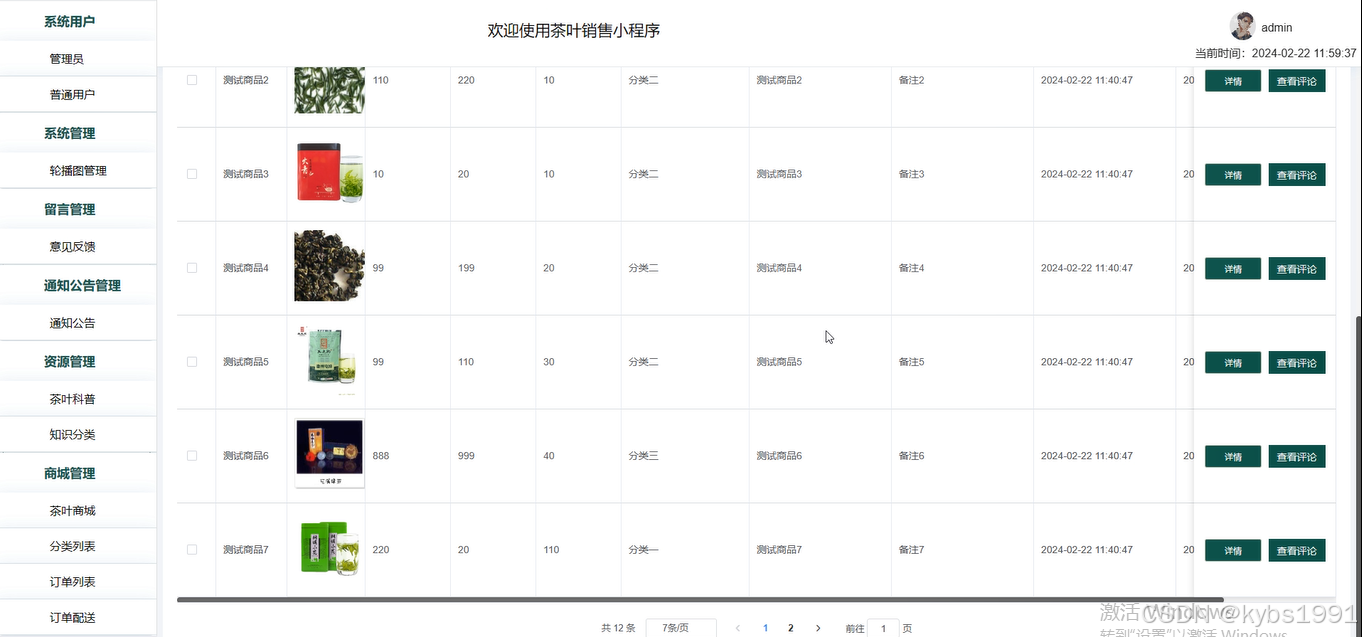 (6)茶叶商城:用户点击可通过选择分类进行查看茶叶产品图片详情,同时可对产品进行收藏、评论和加购操作。