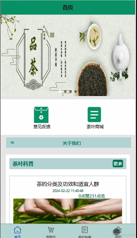首页:当用户进入茶叶销售小程序的时候,首先映入眼帘的是系统首页、轮播图、意见反馈、茶叶商城、网站公告、茶叶科普、购物车和我的。界面展示如下图所示。