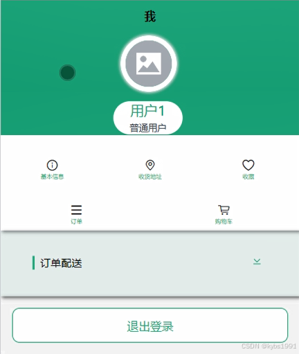 我的:用户点击我的可查看基本信息、添加收货地址,查看个人收藏、订单和购物车。界面如下图所示。
