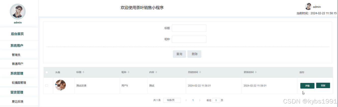 (5)留言管理:管理员点击可查看意见反馈列表,同时可对意见反馈进行回复操作。