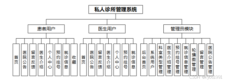 系功能模块分成了管理员、医生用户、患者用户三个模块,每个模块登录进去对应相应的功能,具体的功能模块图如图3.1所示。