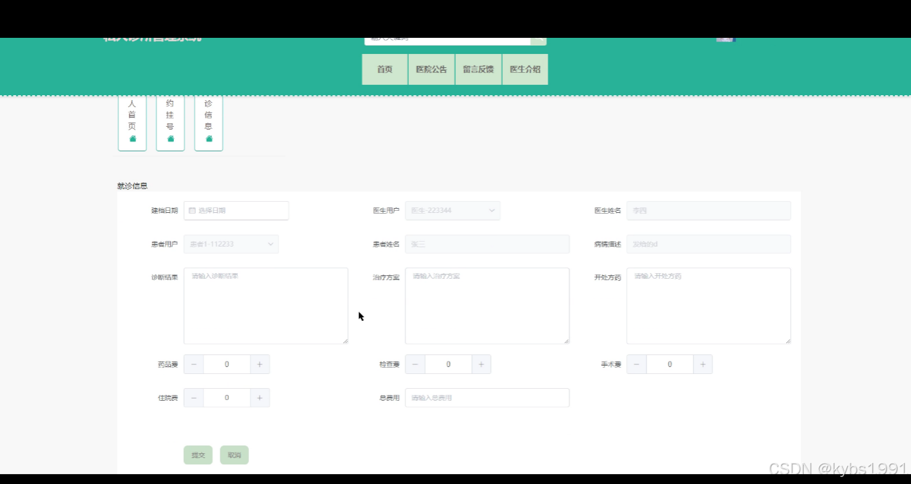就诊信息:医生可以在系统中查看患者的病历并填写就诊信息,了解患者的病情和医疗历史。这样可以提供更加个性化的医疗服务,做出合理的诊断和治疗方案。界面如下图所示。