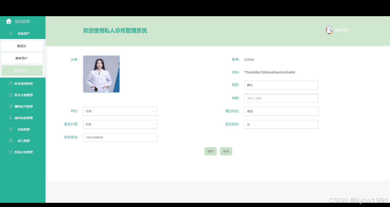 - 个人中心:医生可以登录个人账号,在个人中心查看和管理个人信息。他们可以修改个人资料,如联系方式、工作时间等;