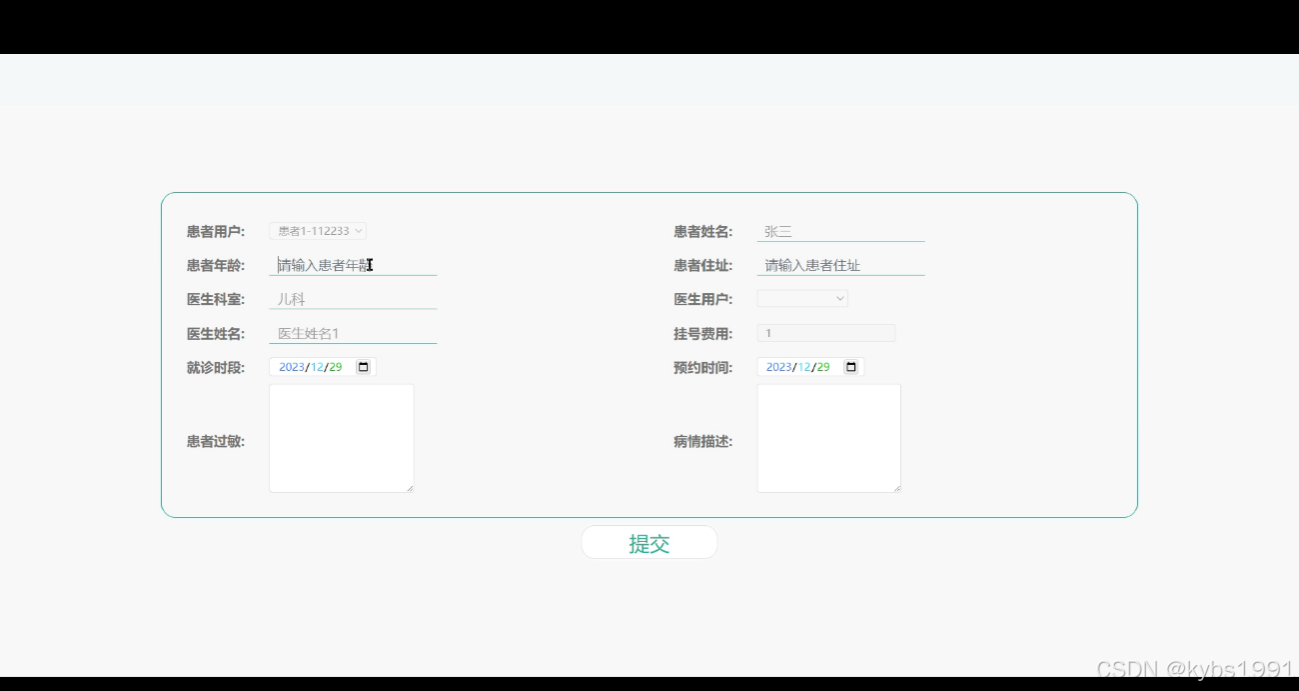 - 预约挂号:患者可以通过系统在线预约挂号,选择合适的时间和医生。他们可以浏览可用的预约时间表,根据个人需求进行选择,并填写包括患者用户、患者信息、患者年龄、住址、医生科室、医生姓名、挂号费用、就诊时段、预约时间、患者过敏、病情描述等相关信息完成预约申请。