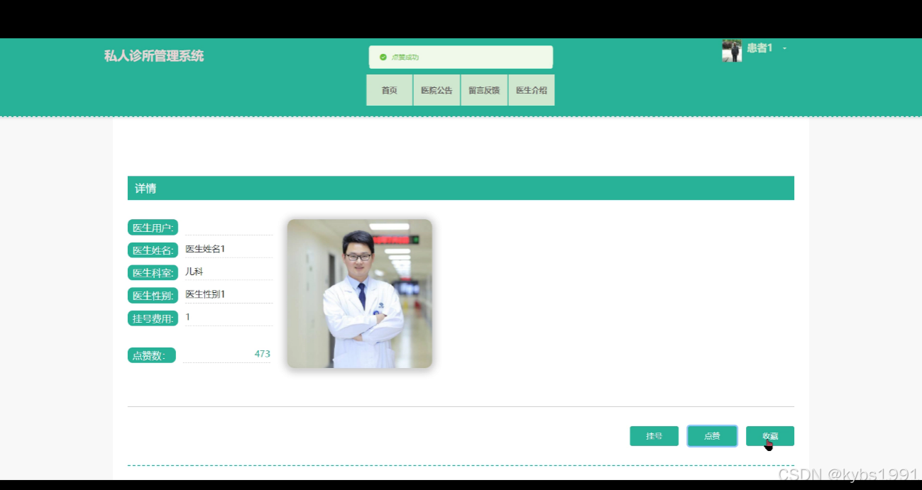 - 医生介绍:私人诊所可以在系统中展示医生团队信息,包括医生用户、医生姓名、医生科室、医生性别、挂号费用、点赞数等信息。患者可以进行挂号、点赞、收藏、评价等操作。