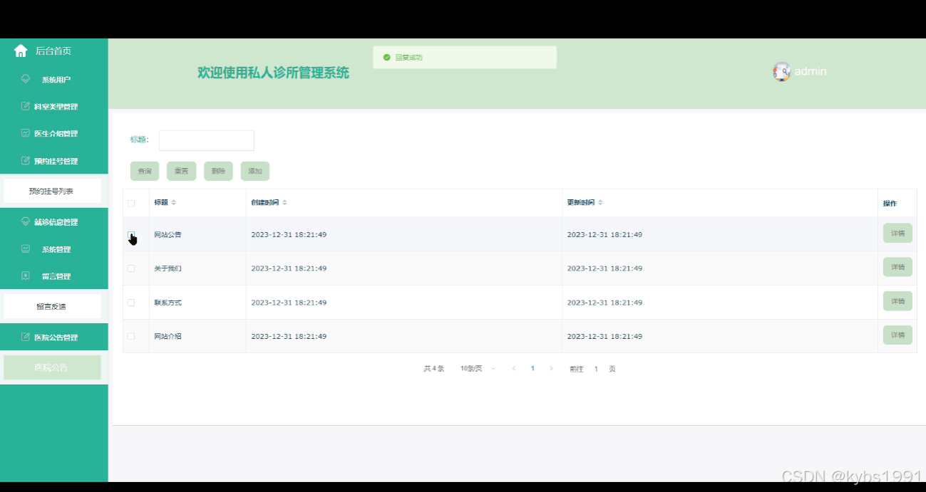 医院公告管理:管理员可以发布、编辑和删除医院的公告和通知。可以根据需要发布医院重要的通知、活动信息等,确保患者和医生都能及时了解到相关信息。界面如下图所示。