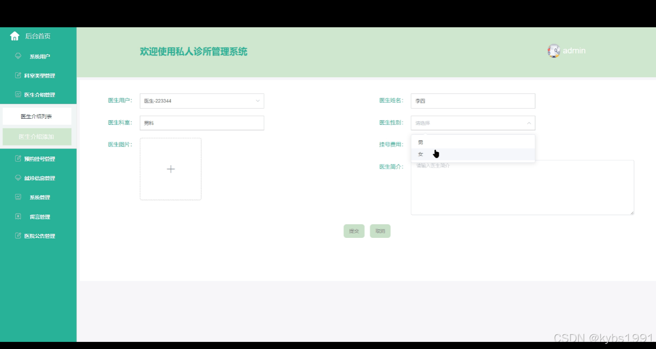 管理员可以添加、编辑和删除医生的介绍和资料。可以上传医生的照片、维护医生用户、医生姓名、医生科室、医生性别、挂号费用等信息,以便展示在系统中。界面如下图所示。