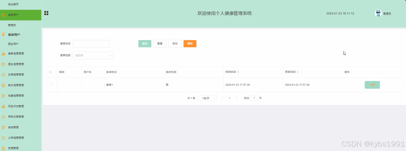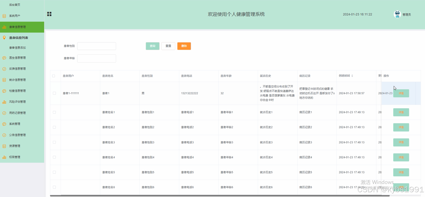 (6)患者信息:管理员点击“患者信息”会显示出所有的患者信息,支持通过患者性别或者患者年龄对患者信息进行查询,如果想要添加新的患者信息,点击“添加”按钮,输入相关信息,点击“提交”按钮就可以添加了,同时可以选择某一条患者信息,点击“删除”进行删除。
