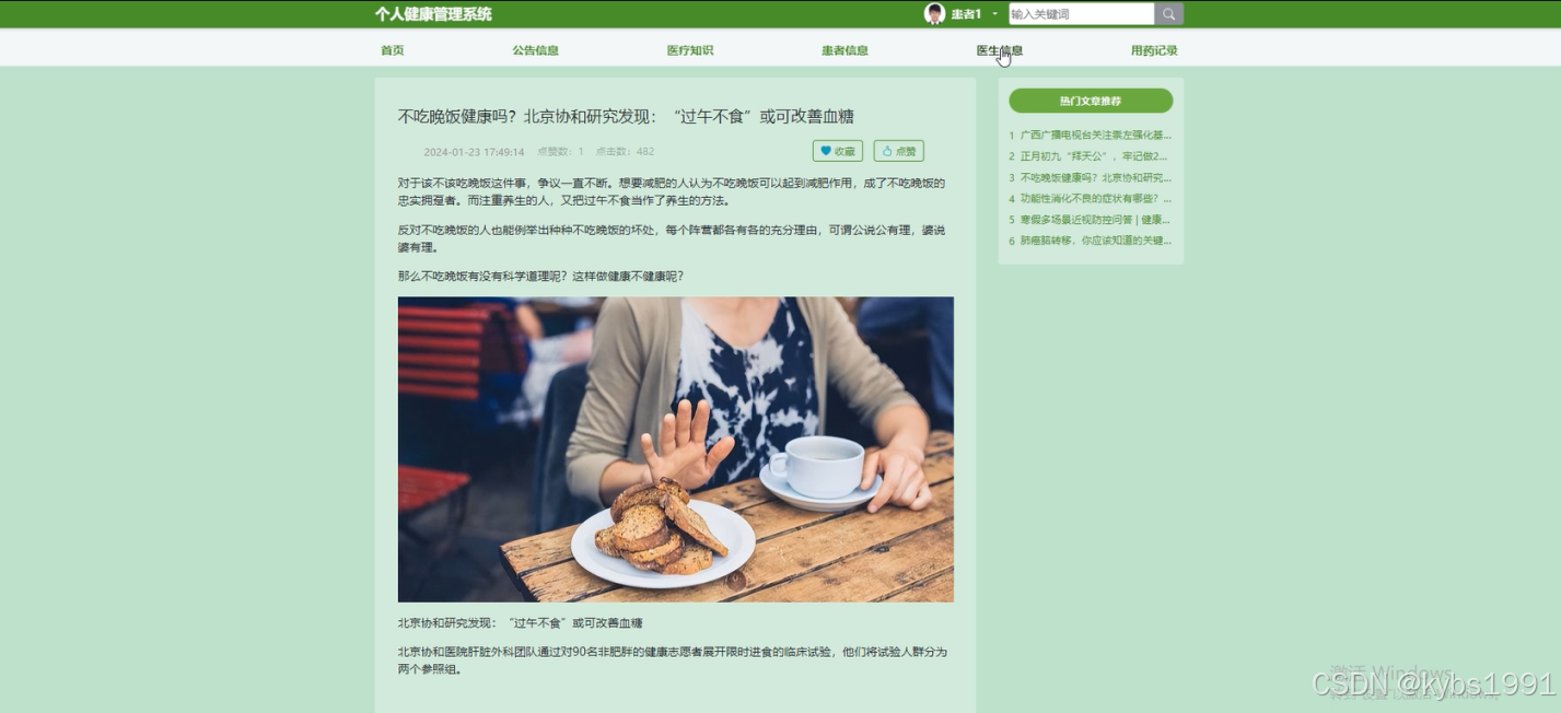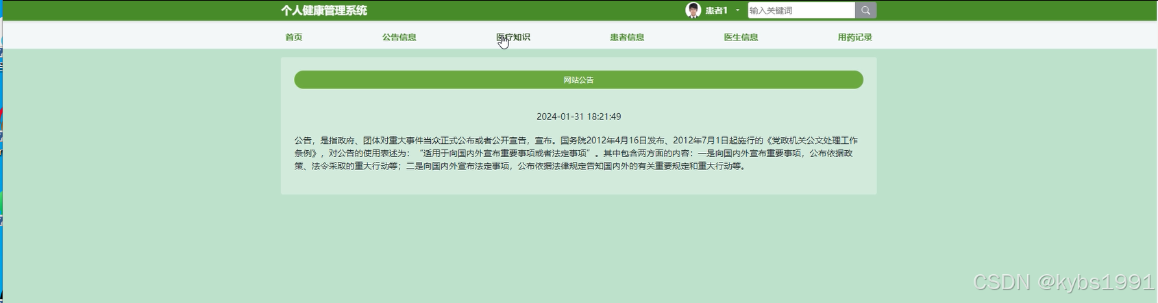 (2)查看个人健康管理系统的首页信息:个人健康管理系统的首页信息包含了首页、公告信息、医疗知识、患者信息、医生信息、用药记录。