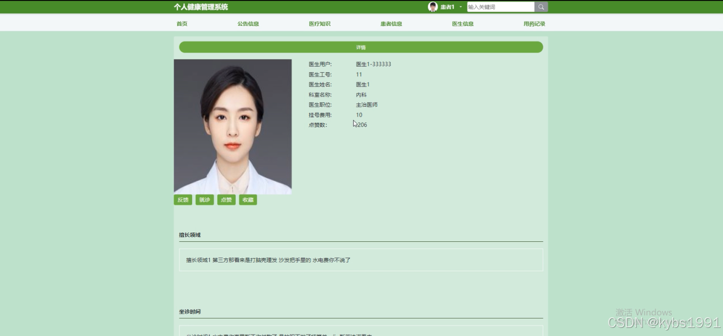 (5)医生信息:当用户点击“医生信息”这一菜单按钮,会显示管理员在后台发布的所有的医生信息,支持通过关键词对医生信息进行搜索,选择需要的医生信息点击可以进入到医生信息详细的介绍界面,在详细界面可以查看到医生信息的科室名称、医生姓名、医生用户、医生工号、医生职位、医生照片、挂号费用、擅长领域等信息,同时可以进行反馈、就诊、点赞、收藏、评论操作;