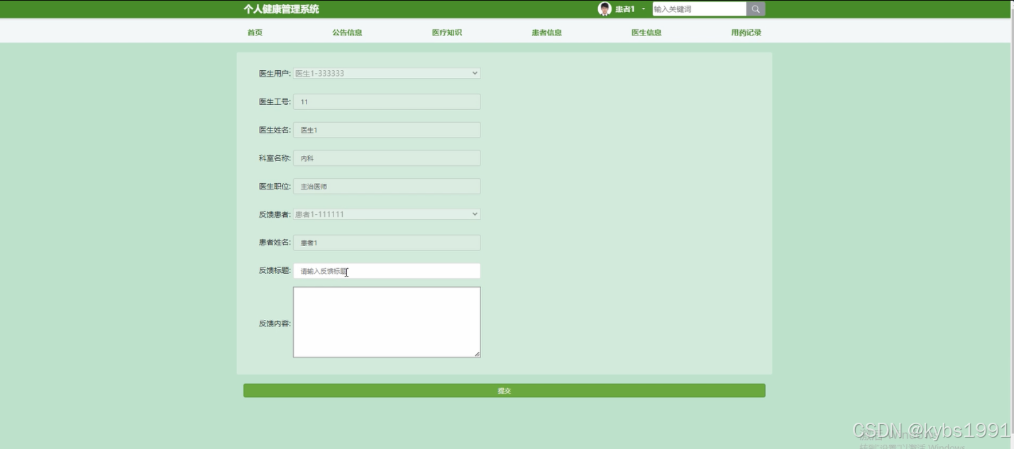 (6)反馈:当用户在医生信息详情界面想要进行反馈,点击下方的“反馈”按钮,就会跳转到反馈信息填写界面,根据界面提示输入反馈信息,点击“提交”按钮,反馈就完成了;