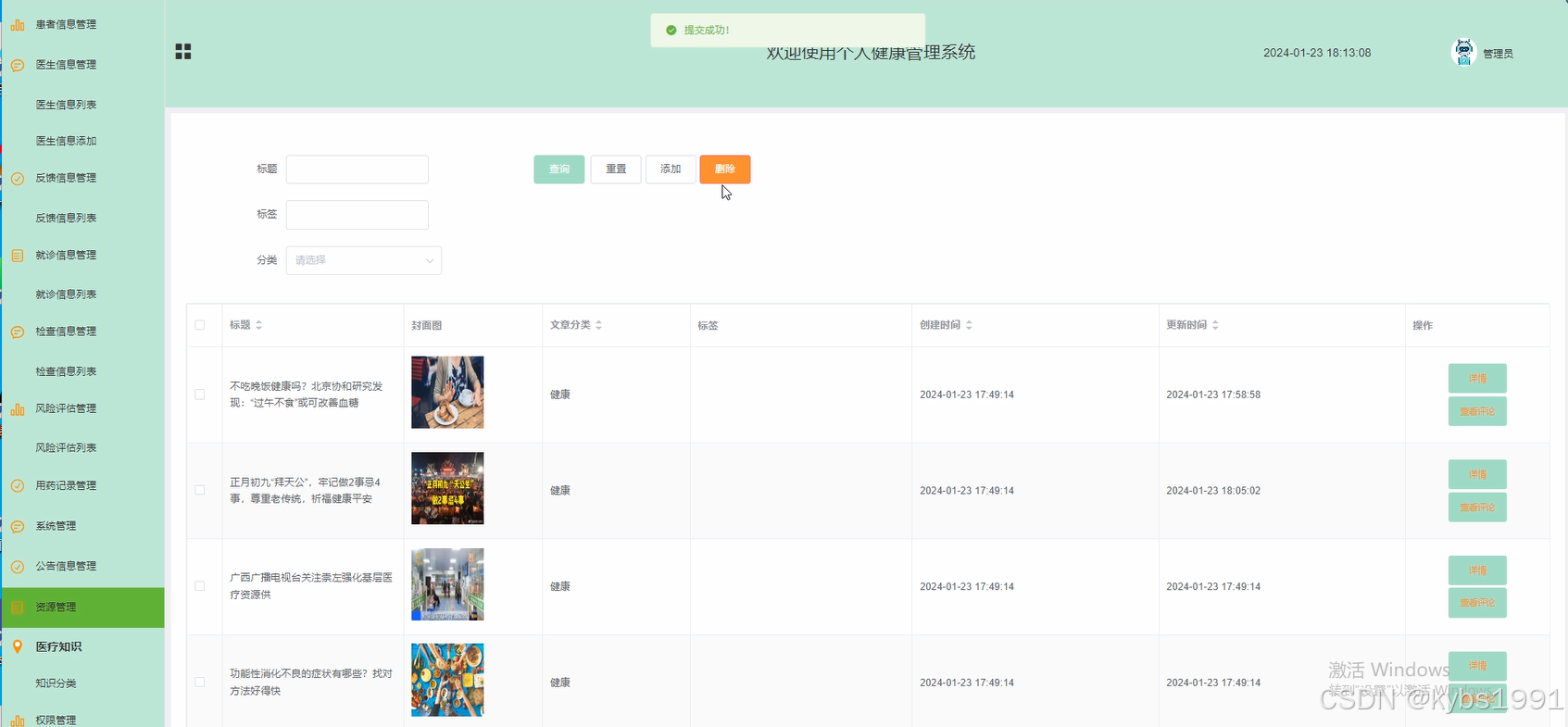 (3)资源管理:管理员点击“资源管理”菜单能够对其下子菜单医疗知识和知识分类进行增删改查。