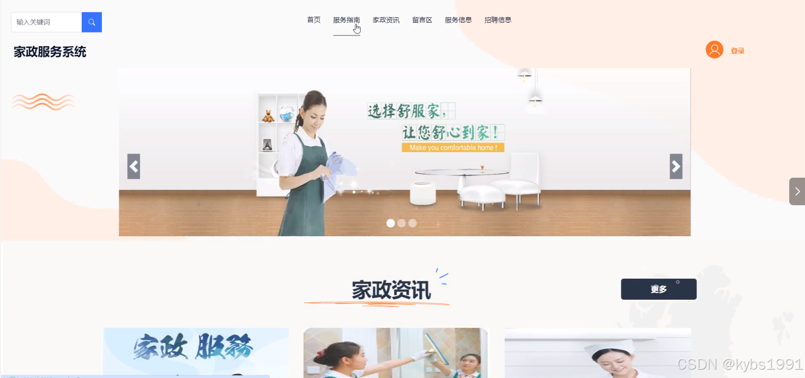 1)首页:可以查看首页展示的轮播图、家政资讯、服务信息推荐等信息。