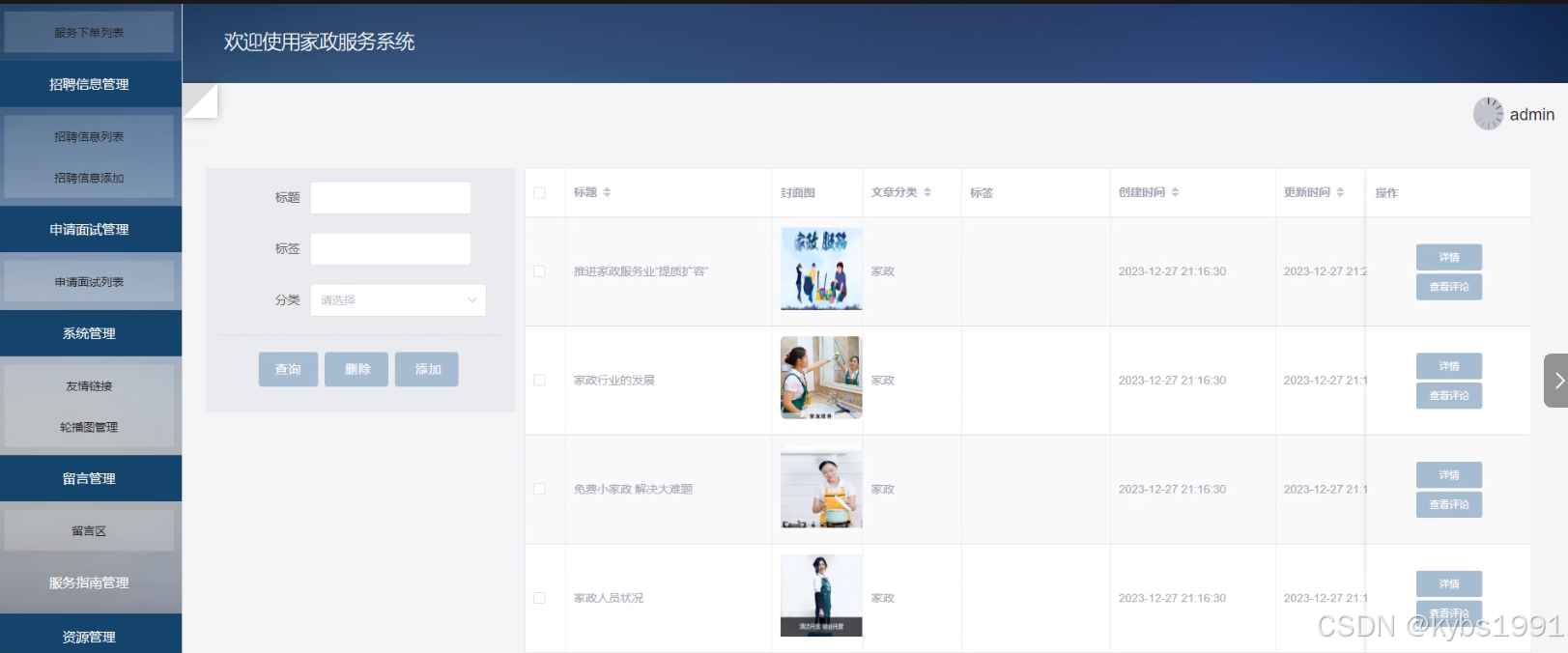 10)资源管理:管理员可以添加资讯分类信息,可以查看家政资讯列表中的某一资讯详情和评论信息,可以对家政资讯列表信息进行查询、添加和删除操作。