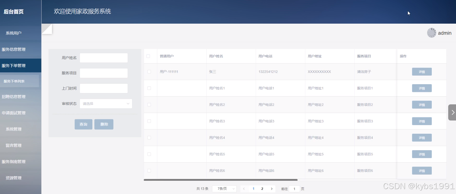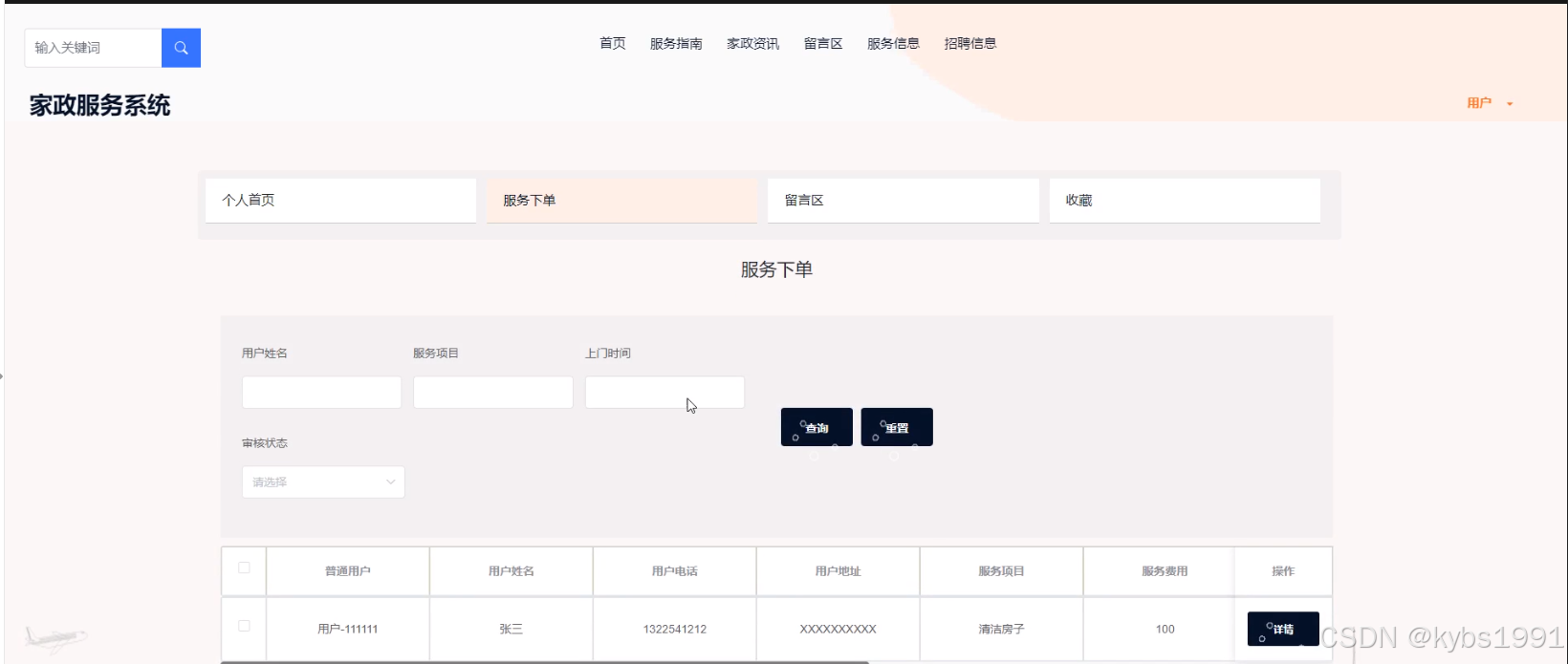 4) 服务下单管理:管理员可以对查看服务下单列表中的某一信息详情并进行审核和回复,可以对服务下单信息进行查询和删除操作。