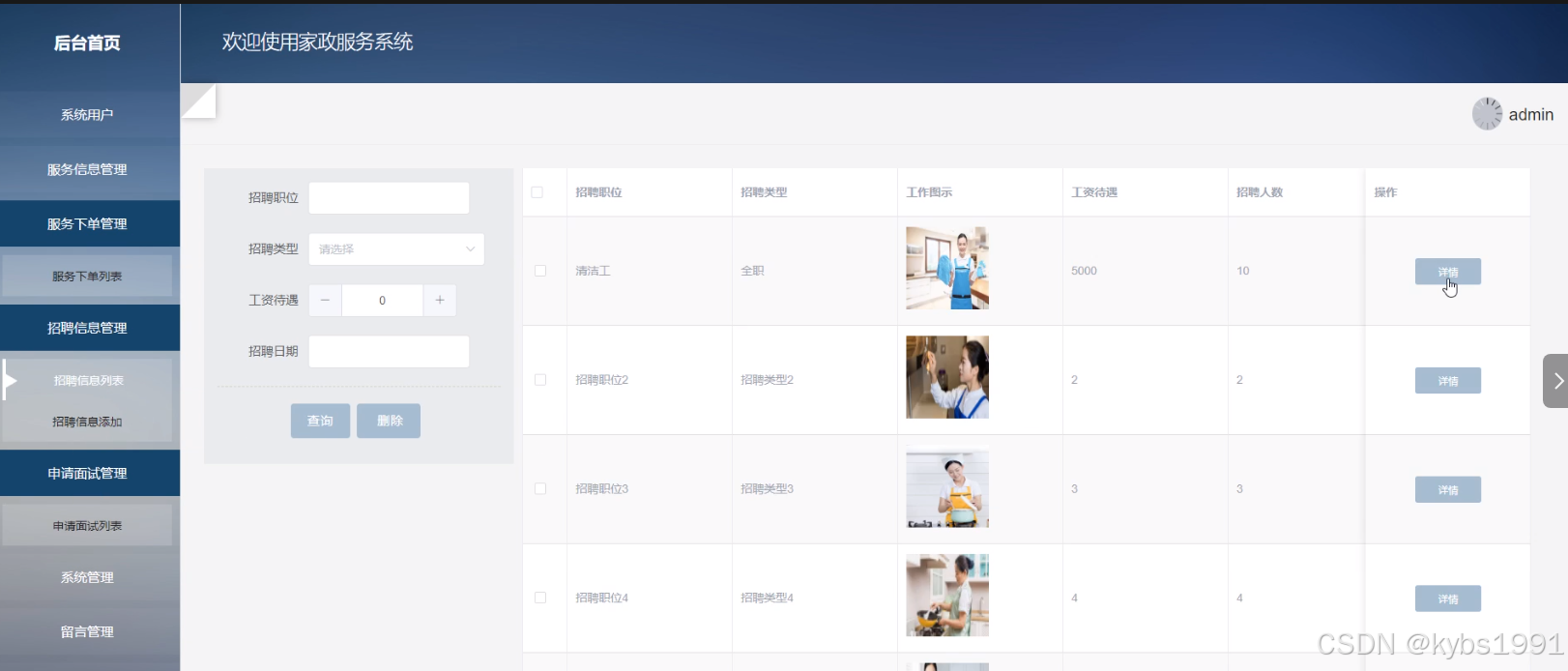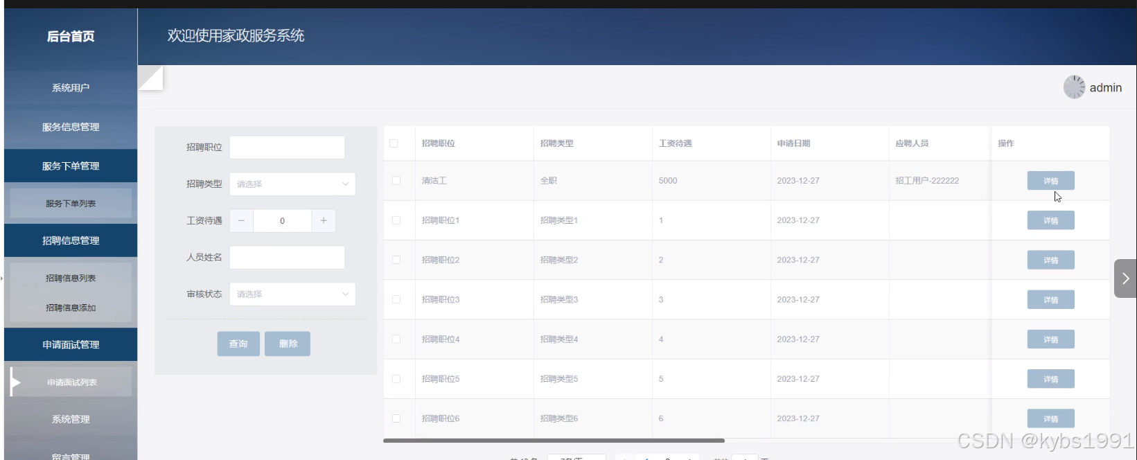 5) 招聘信息管理:管理员可以添加招聘信息,可以查看招聘信息列表中的某一信息详情,可以对列表信息进行查询和删除操作。