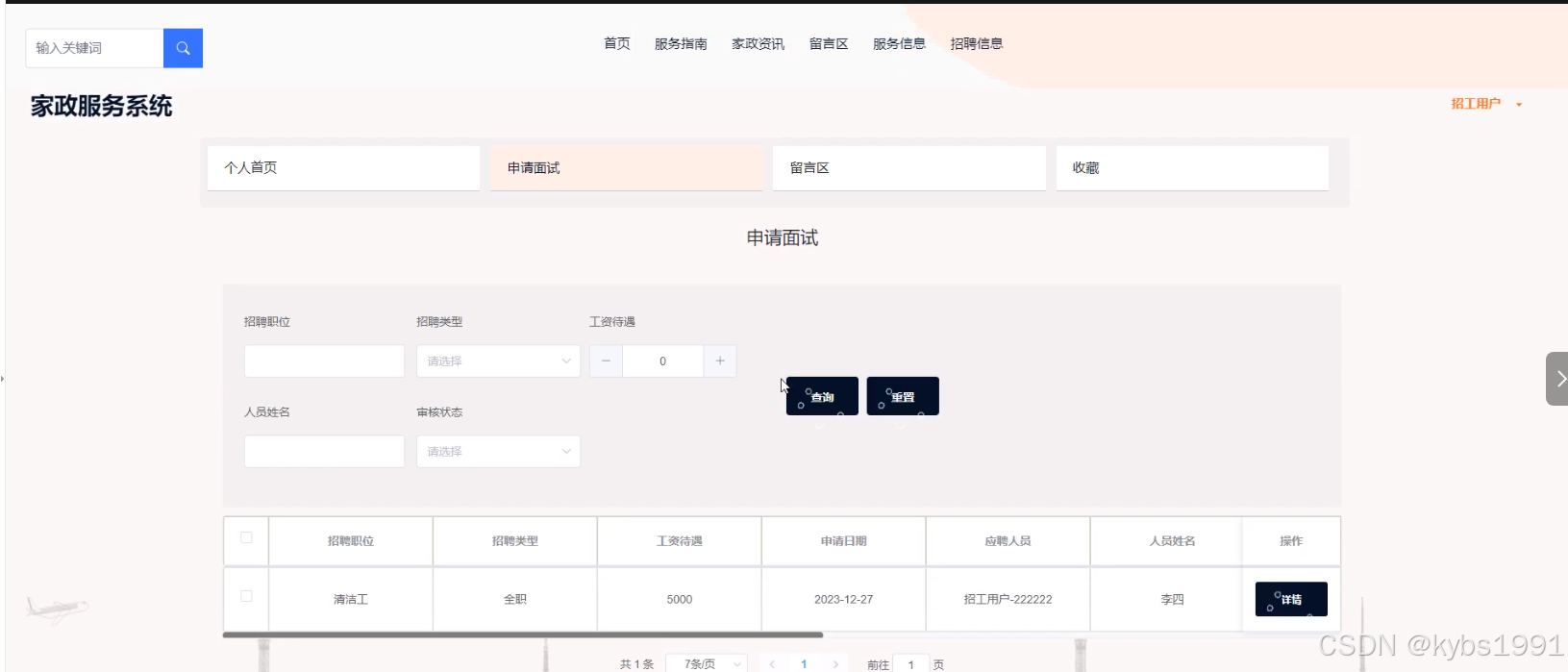 7 招聘信息:用户可以查看招聘信息列表中的某一信息详情并可以完成在线面试申请操作。
