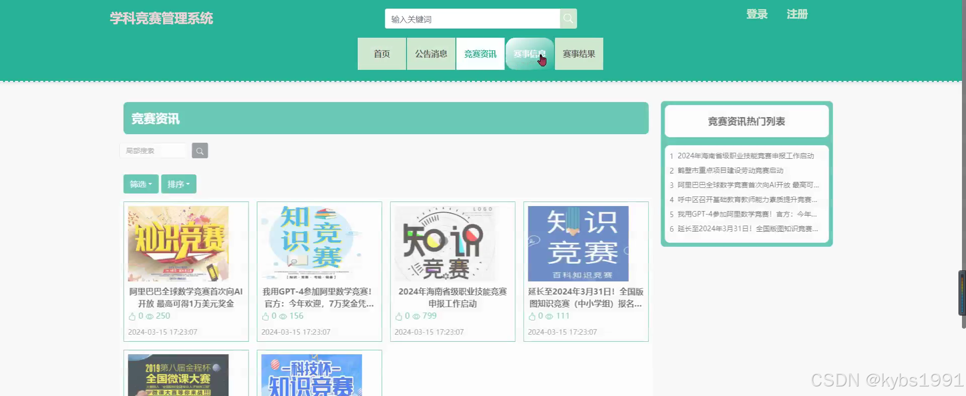 学科竞赛管理系统选择Eclipse开发工具的java开发语言中springboot+mysql数据库来存储数据,实现了注册登录、竞赛信息、竞赛报名、竞赛成绩、赛事结果这几大功能。