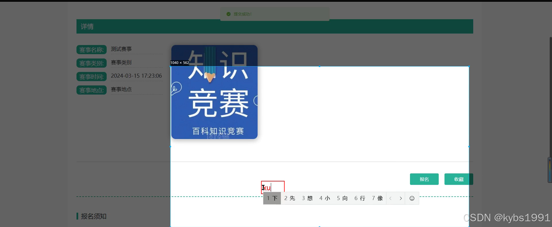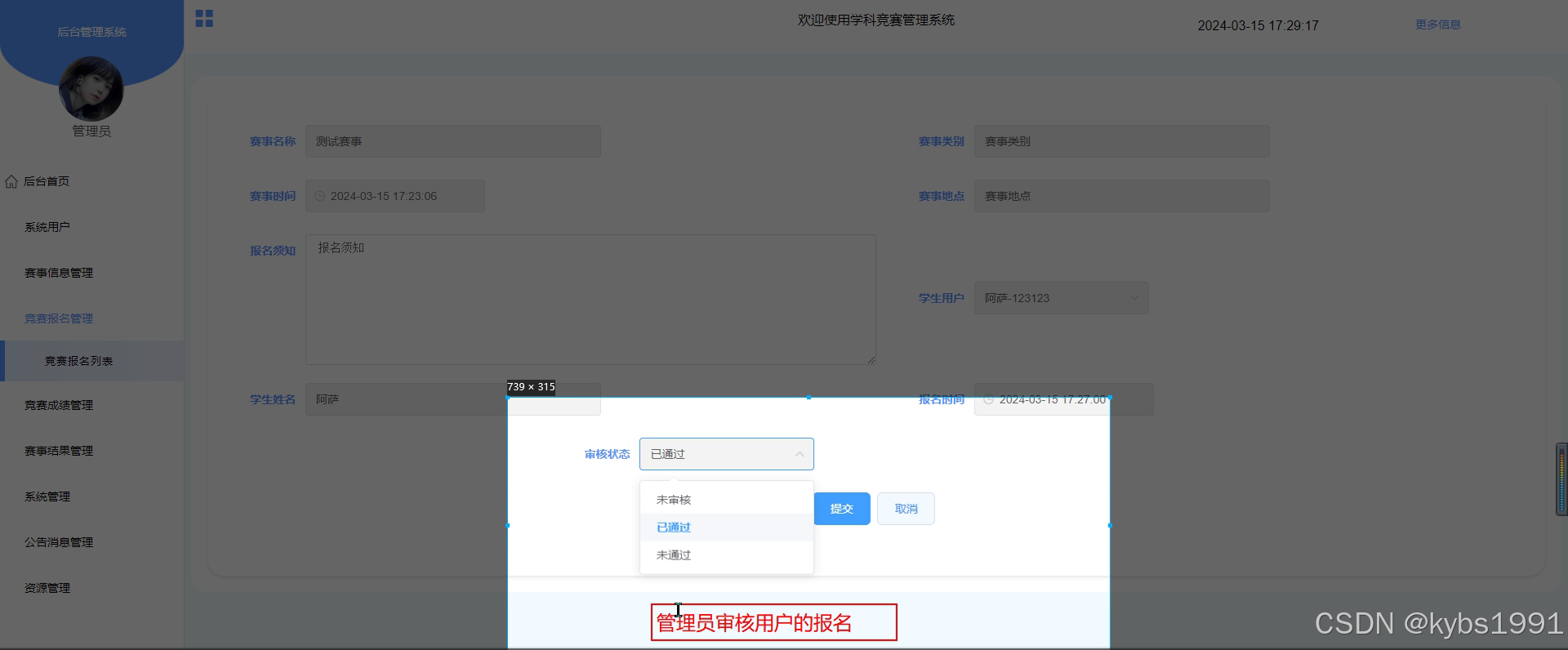 (4)竞赛报名:点击“竞赛报名”这个按钮就会显示出报名页面,需要提交报名信息进行提交,管理员对用户提交的竞赛报名信息进行审核管理;