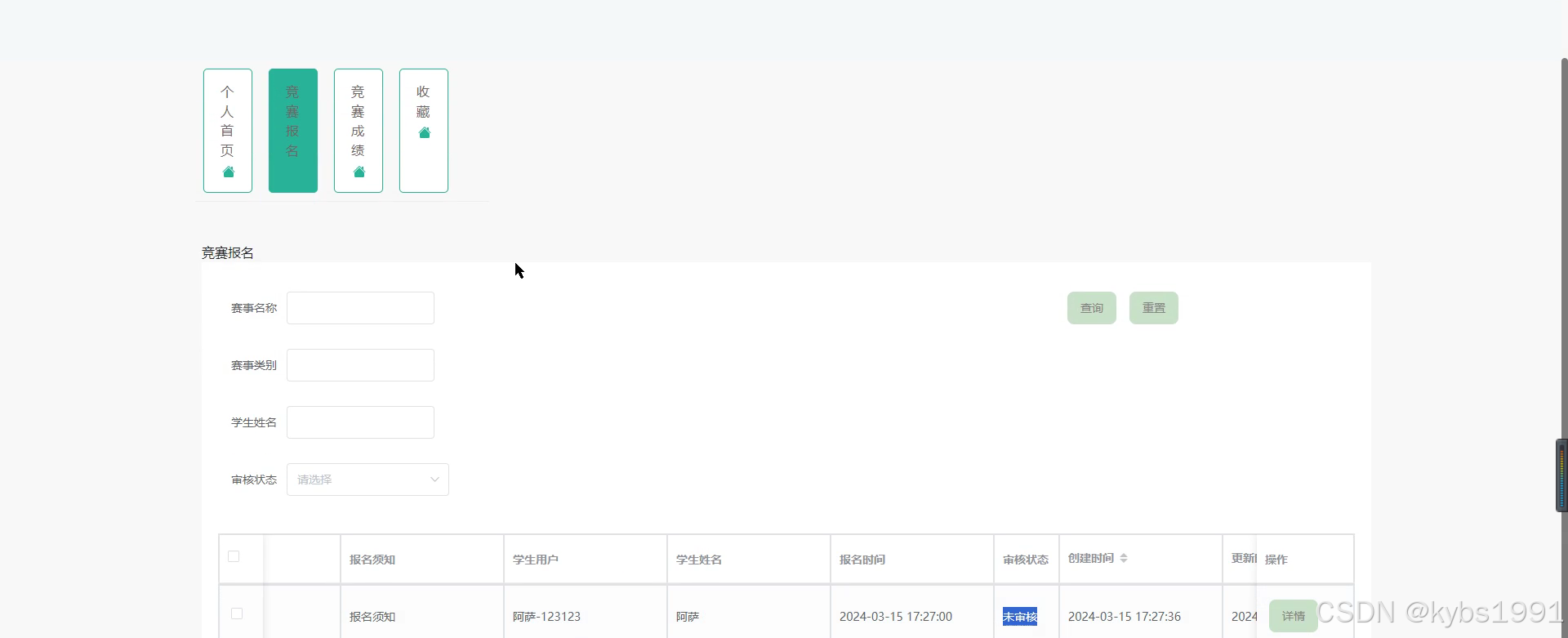 点击“竞赛报名管理”这个按钮就会显示出所有的竞赛报名的信息,可以查看以及审核。界面如下图4.9所示。
