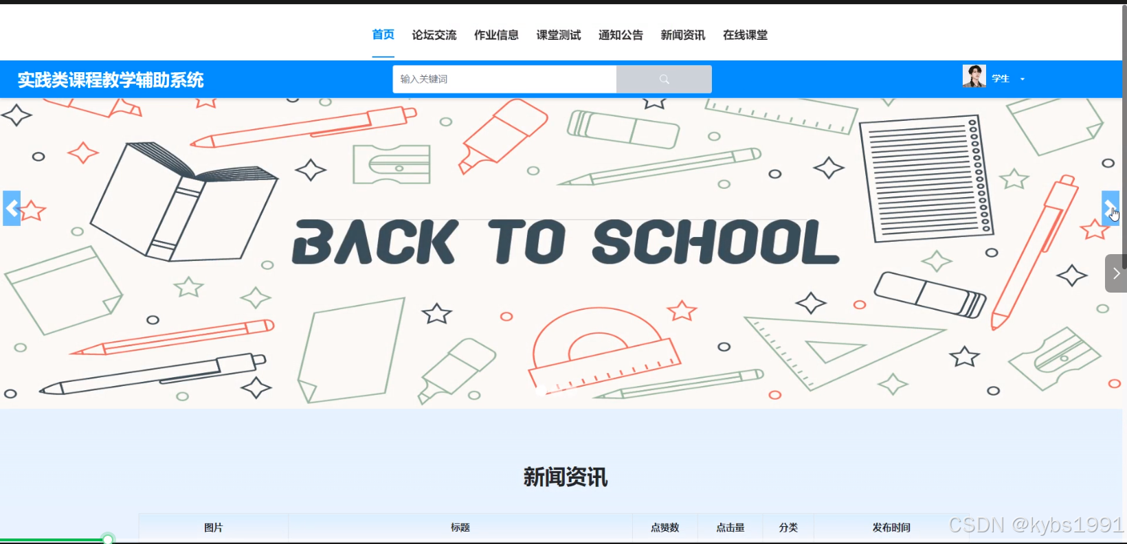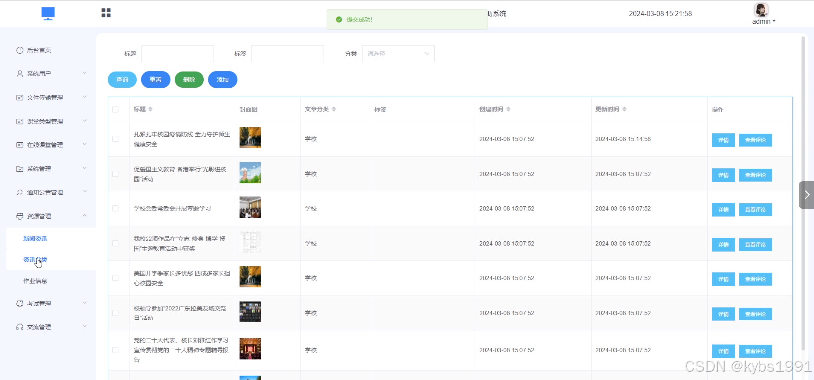 - 资源管理:管理员可以查看新闻资讯列表中某一资讯的详情和评论信息;可以对新闻资讯、资讯分类、作业信息进行查询、重置、添加和删除操作。