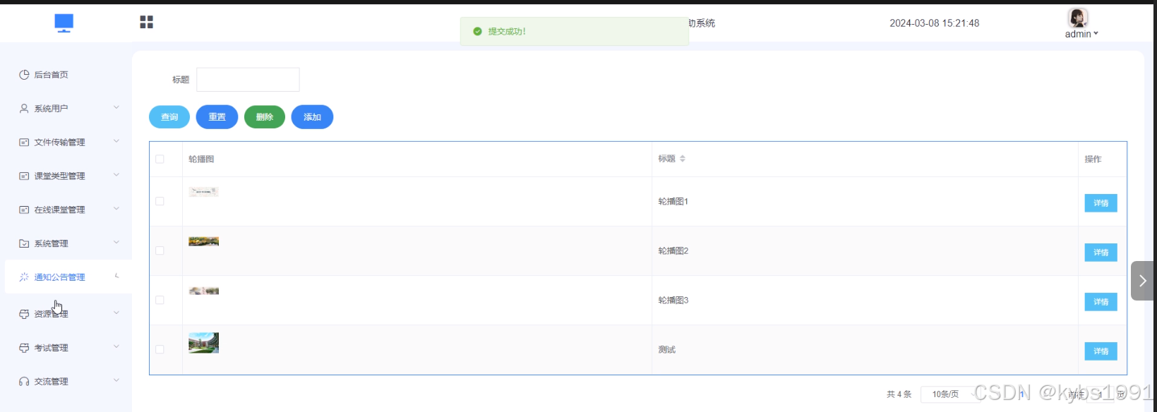 - 系统管理:管理人员在“系统管理”这一菜单下对轮播图进行管控,可以对轮播图信息进行查询、重置、添加和删除操作。