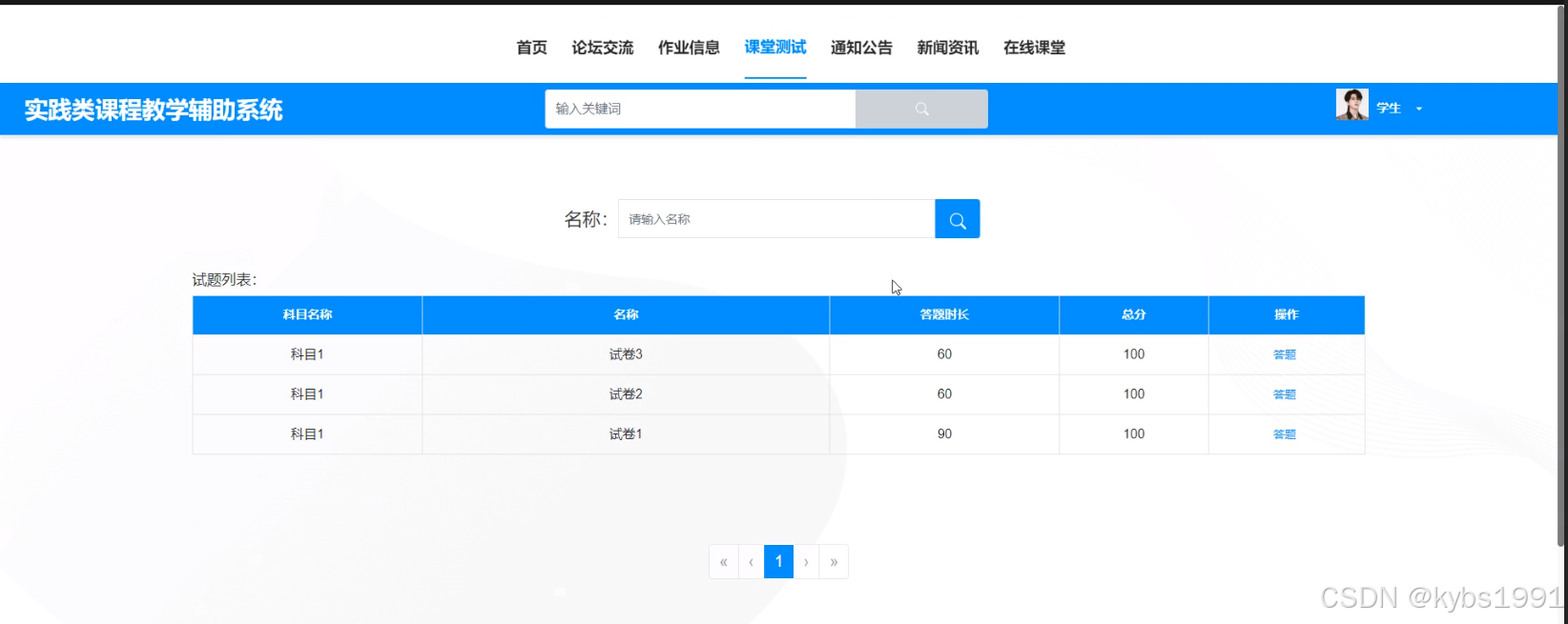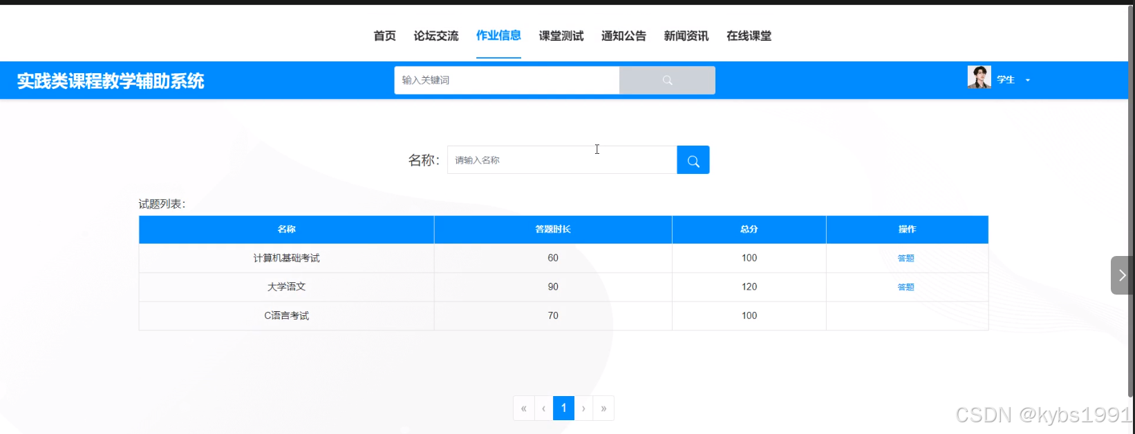 - 课堂测试:用户点击导航栏的“课堂测试”进入页面可以试题列表信息并可以在线答题和查看分数。