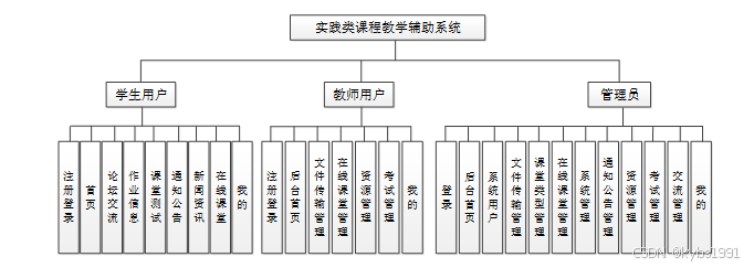 按照实践类课程教学辅助系统的角色,主要包括学生用户、教师用户和管理员这三大功能模块。