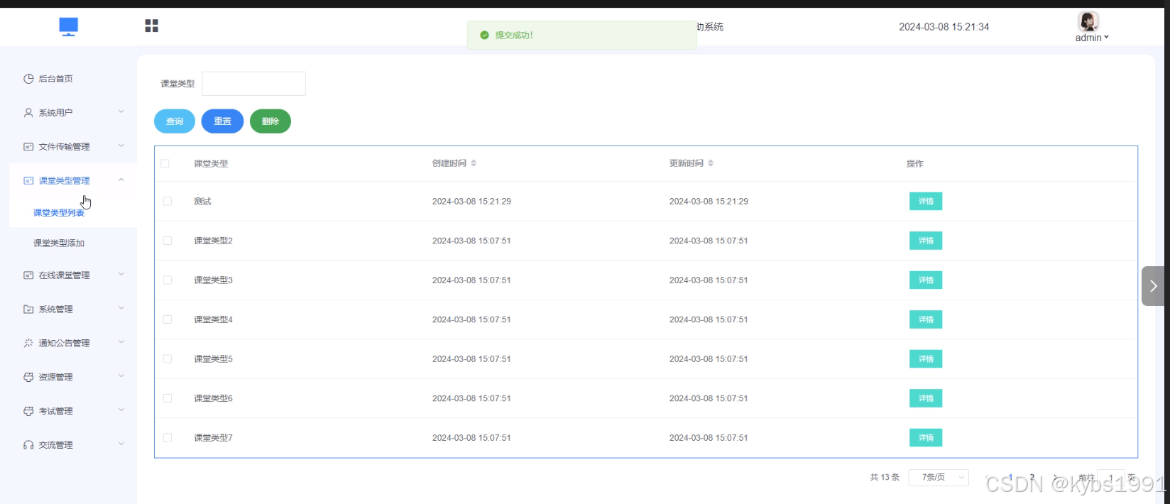 - 课堂类型管理:管理人员可以查看课堂类型列表中某一类型的详情,可以对列表信息进行查询、重置、添加和删除操作。