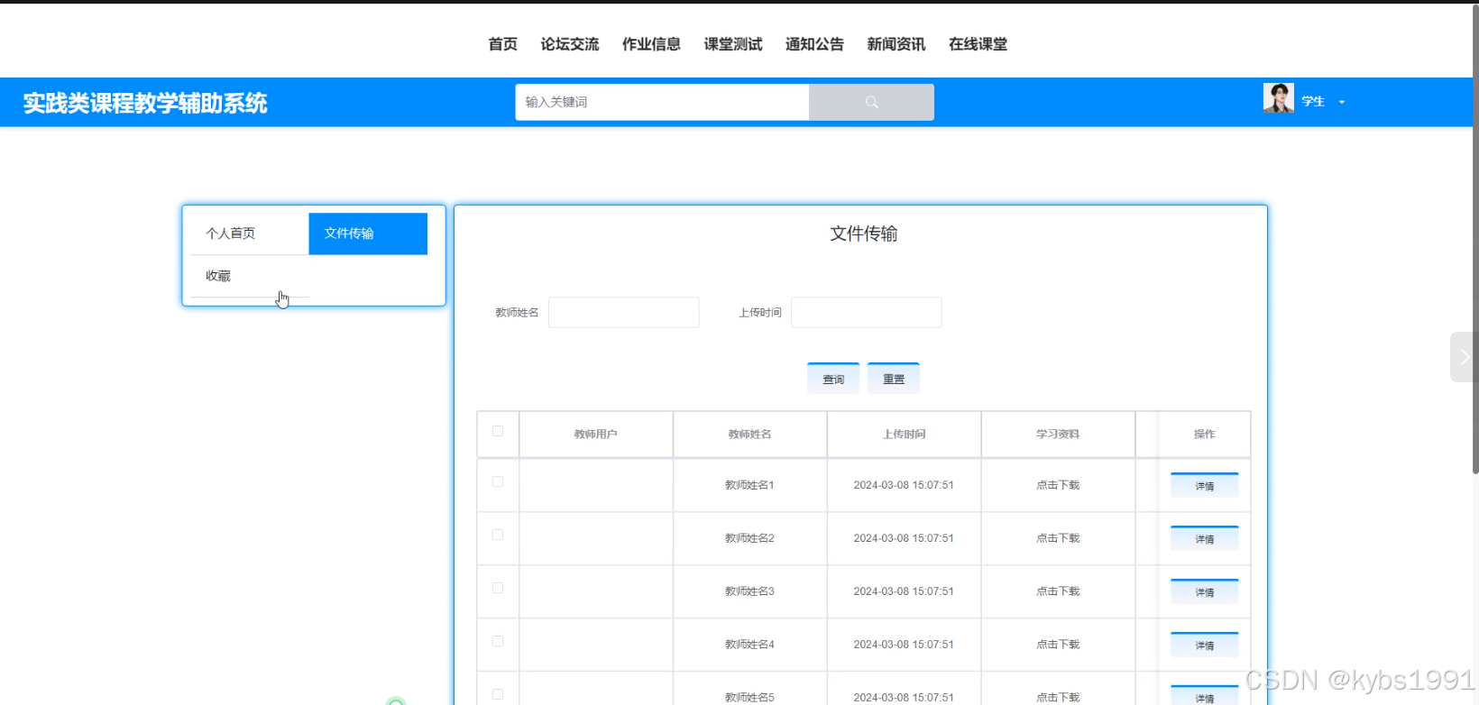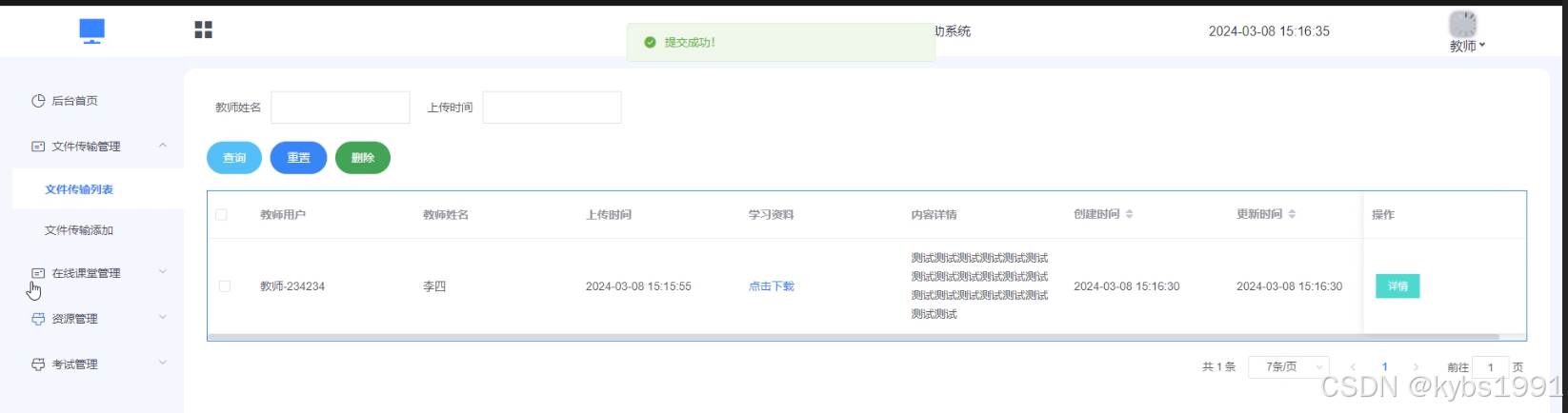 - 文件传输管理:教师用户可以查看文件传输列表中某一文件传输的详情,可以对列表信息进行查询、重置、添加和删除操作。