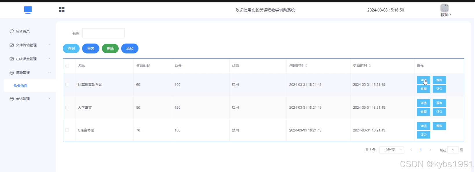 - 资源管理:教师用户可以查看作业信息列表中某一作业的详情并提交题库、答题、评分信息,可以对作业信息进行查询、重置、添加和删除操作。