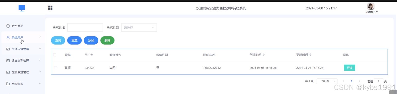 - 系统用户:管理员可以查看系统用户(管理员、学生用户、教师用户)列表中某一用户的详情,可以对用户信息进行查询、重置、添加和删除操作。