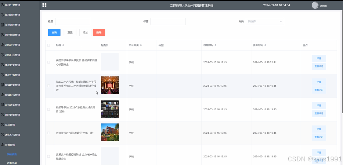 管理员点击“资源管理”菜单,管理员发布和管理学校资讯信息以及资讯的分类和标签。界面如下图所示。