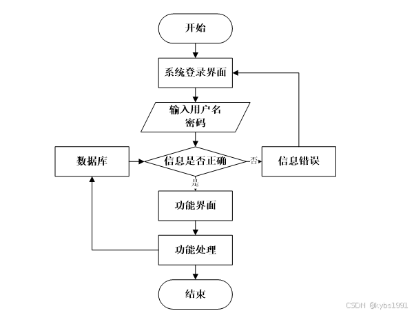 用户打开并进入系统后,会先显示登录界面,输入正确的用户名和密码,系统自动检测信息,若信息无误,则用户会进入系统功能界面,进行操作,否则会提示错误无法登录,操作流程如图2-3所示。