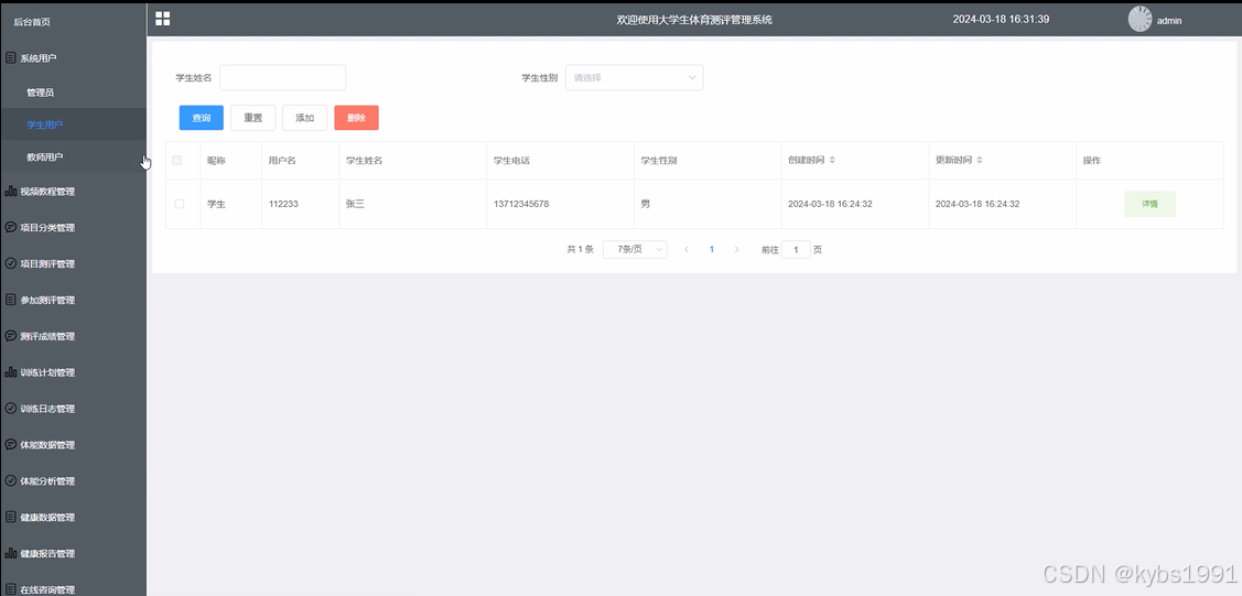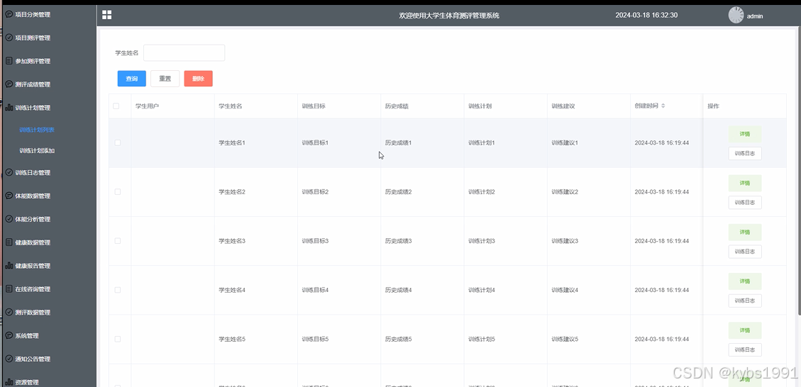 In terms of functional modules, the system has implemented multiple core functions, including video tutorial management, project classification management, project evaluation management, participation evaluation management, evaluation score management, training plan management, training log management, physical fitness data management, physical fitness analysis management, health data management, health report management, online consultation management, evaluation data management, etc. The design of these functional modules aims to meet the comprehensive management needs of university sports management departments for sports evaluation data, improve management efficiency and data accuracy.