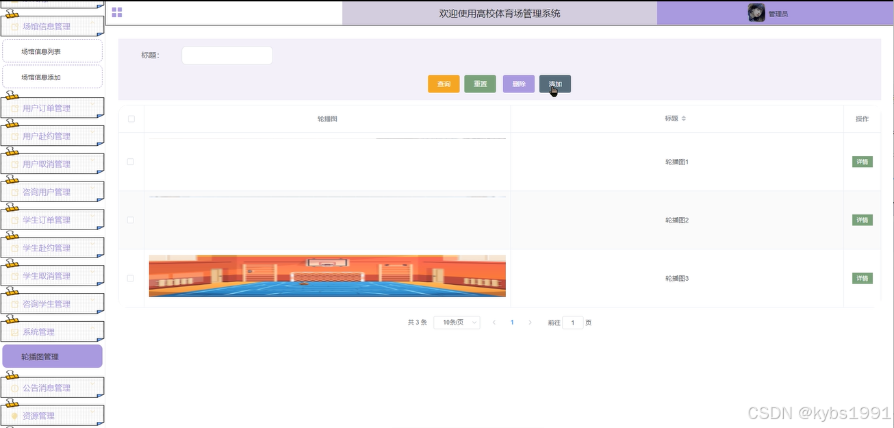 系统管理:当管理员点击“系统管理”时,可查看轮播图; 如需添加新的轮播图,点击右侧“添加”按钮,上传图片,输入标题,点击“确认”按钮进行添加;同时可对轮播图进行查询、删除和重置。界面如下图所示。