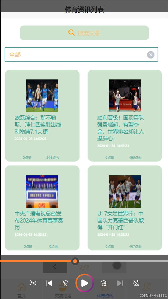 体育资讯:“体育资讯”板块为普通用户提供了丰富的体育新闻和资讯内容。用户可以查看系统推荐的热门文章,了解最新的体育赛事和动态。同时,他们还可以对文章进行点评和评论,与其他用户分享自己的见解和感受。此外,该板块还提供了基于文章内容的搜索功能,帮助用户快速找到感兴趣的资讯。界面图如下。