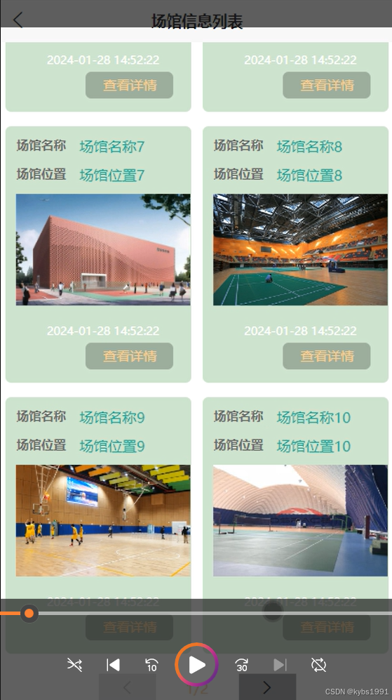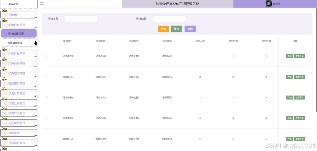 场馆信息管理:管理员拥有查看场馆信息列表的权限,可以执行添加、查看详情、查看用户评论等操作,并具备通过场馆名称和位置进行搜索的功能,以便快速定位特定场馆信息。界面如下图所示。
